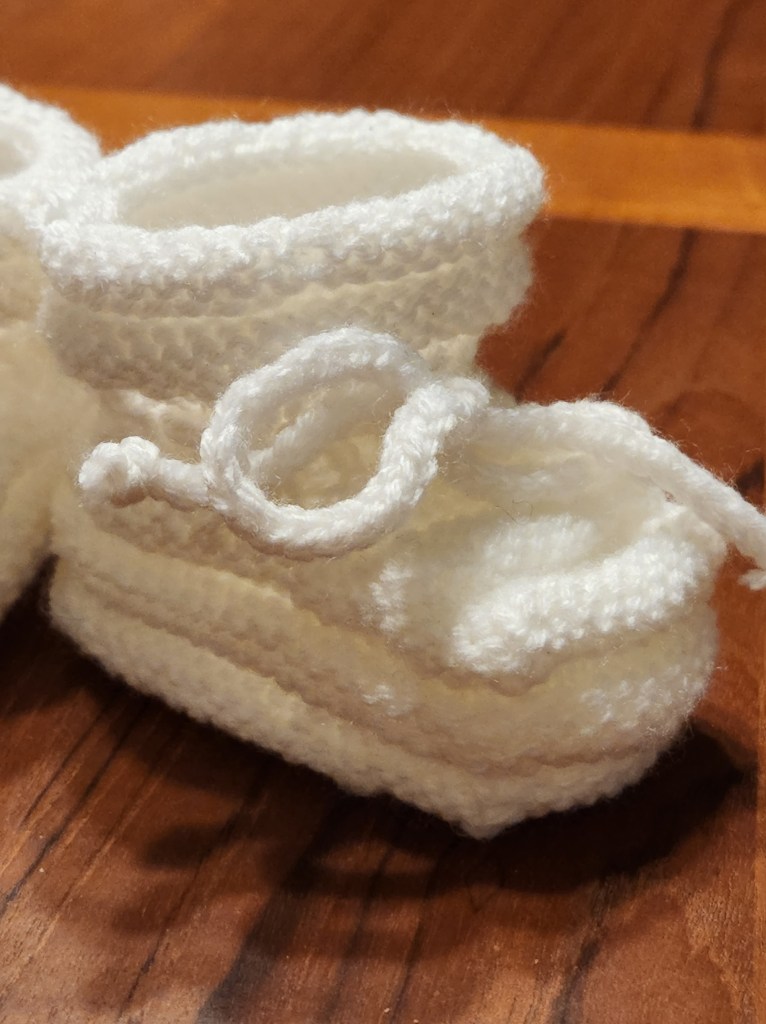 One of the more notable items my grandmother was famous for was her Booties. I have affectionally named them “Nana’s Bubble Booties”. She could knit a pair of booties in a few hours. She knit them by the dozens and they were in big demand at the “Knit and Needle” Shop where she worked part time after retiring, in Spokane Washington where she lived. It was “busy” work for her, people loved them and bought them mostly as shower gifts for newborns.